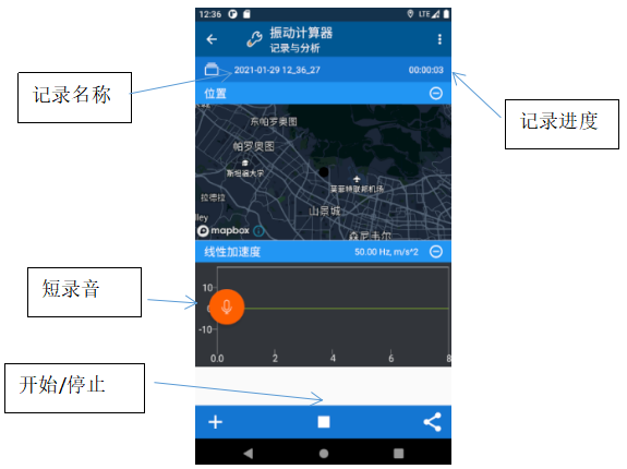 记录完成后可点击“分享”按钮,将刚刚记录的数据将会被压缩成zip文件,并调用系统的分享功能进行分享,具体的分享方式取决于所用设备的系统设置。