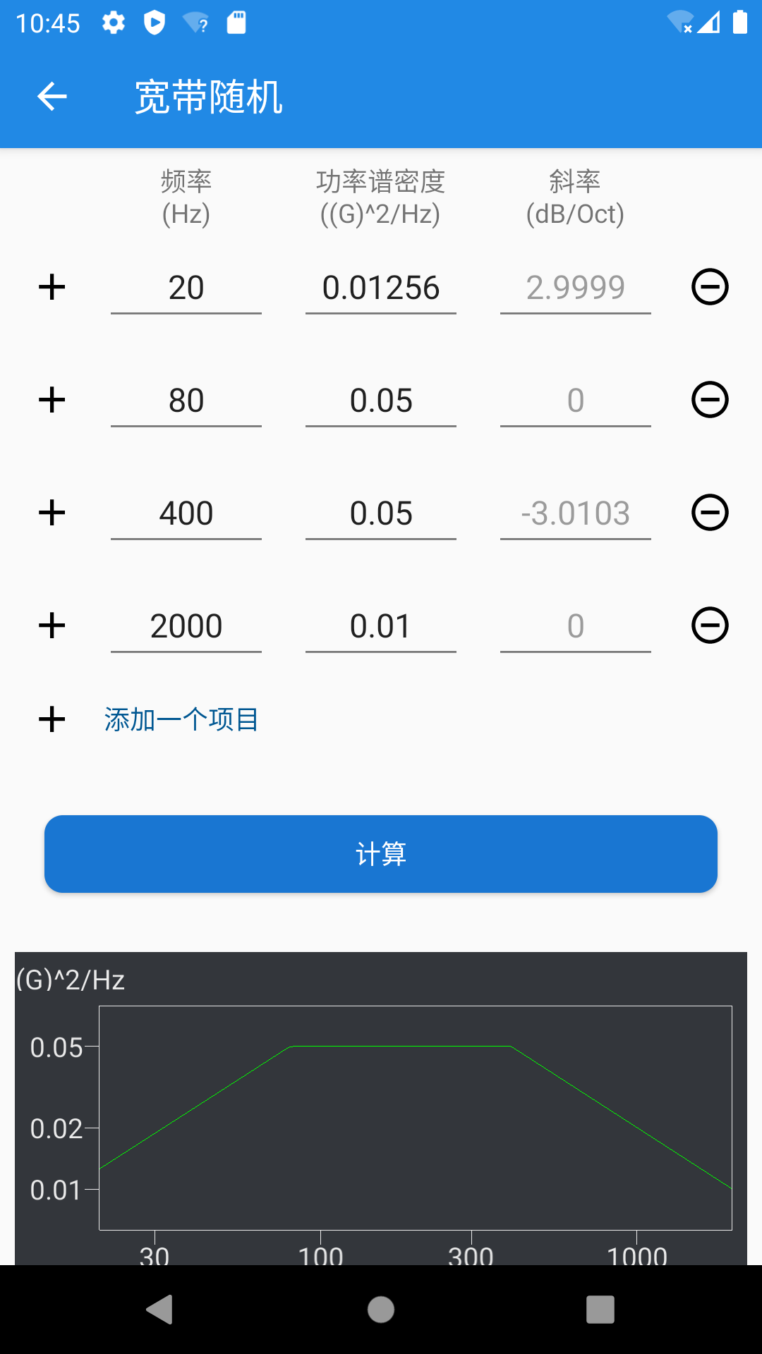 宽带随机与随机目标谱计算基本一致,您可以自由添加、删除目标谱参数,谱的类型由上一级界面“谱类型”确定。点击“计算”可得到目标谱曲线。