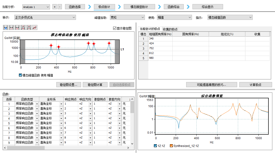 极点估计 极点估计主要用于粗略的估计结构极点,在此处可以使用多种模态指示函数、稳定图进行判断,您也可以在此处确定使用模态分析方法,选择实际参与分析的函数,并查看拟合情况,随时修改估算的极点。 界面结构 其界面结构如下: 基本操作流程 模态指示函数 稳定图 正交多项式法 极点估算 Poly-Z法 Poly-Z稳定图 极点估算 函数列表与综合预览