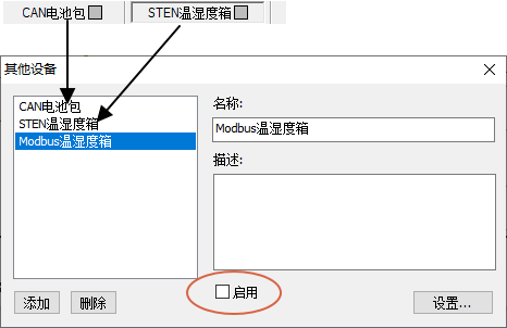 每一个设备标签页对应一台启用的第三方设备。未勾选“启用”的设备,不会显示在标签页中,并且在连接、监视和记录中不会起作用。