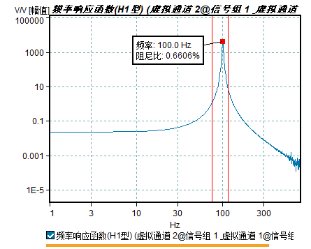 频域信号的阻尼光标可选峰值监测、圆拟合、正交多项式和传递函数拟合方法。通过拖拽峰值两侧的竖线,可以修改分析的频率范围。峰值监测和圆拟合将给出频率和阻尼比。正交多项式还会绘制拟合曲线。传递函数拟合则给出传递函数系数,并绘制拟合曲线。