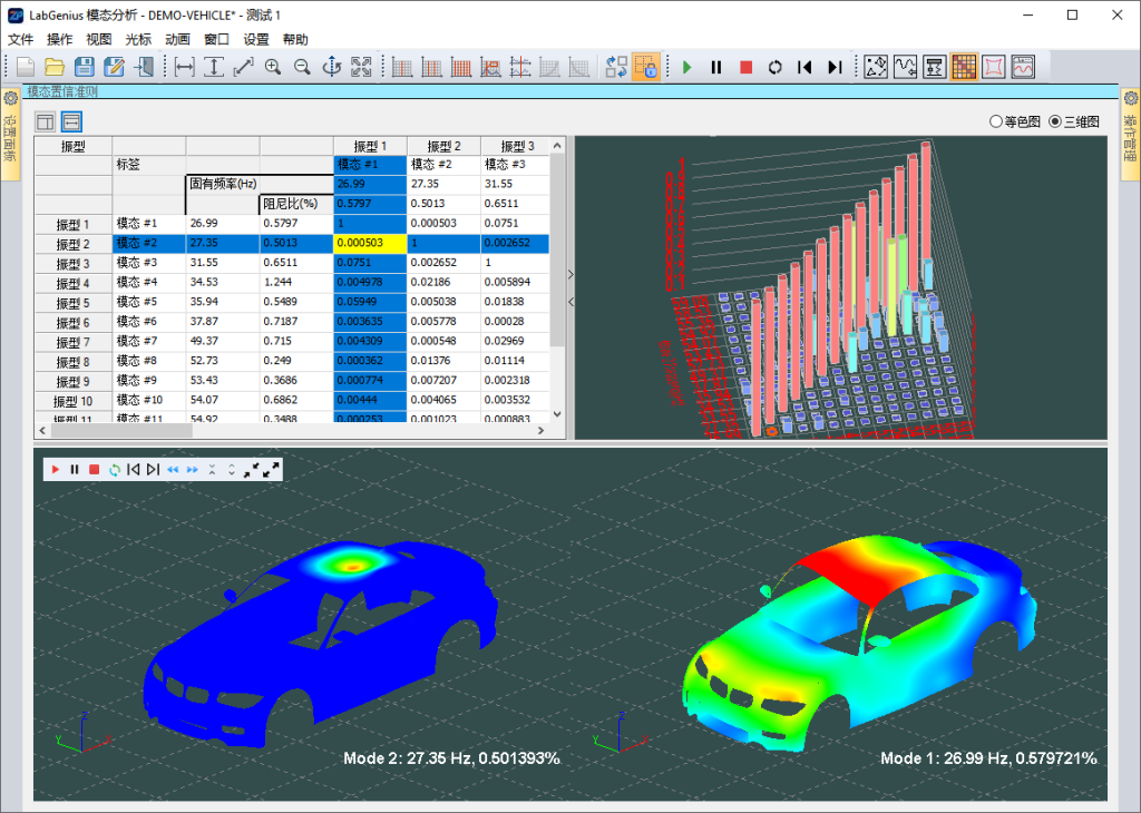 1) 提供模态置信表格、等色彩图以及三维柱状图;
